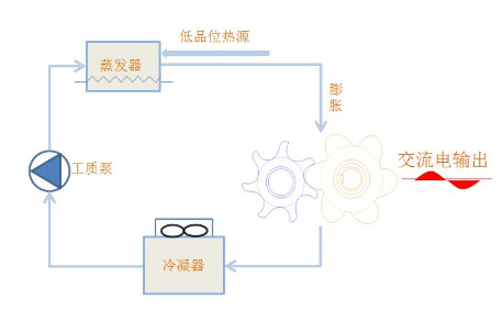 基于有機郎肯循環(huán)(Organic Rankine Cycle簡稱ORC)原理,利用低品位熱源產(chǎn)生動力:通過低沸點有機工質(zhì)獲取其他介質(zhì)的熱能,轉(zhuǎn)化為壓力能,通過膨脹機將壓力能轉(zhuǎn)化為機械能,最終通過發(fā)電機將機械能轉(zhuǎn)化為電能。